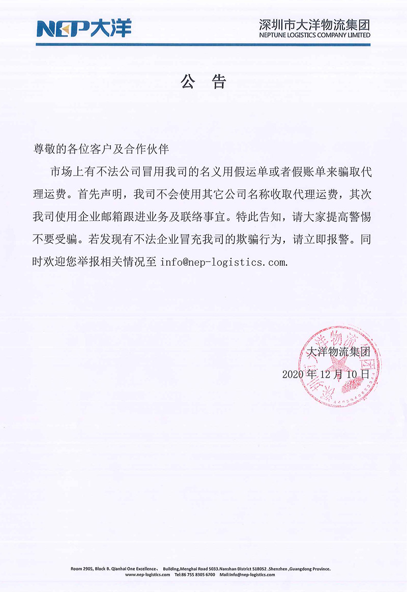 In the market, some unscrupulous companies fraudulently use fake waybills or false bills in the name of our company to defraud agency freight. First of all, it is stated that we will not use other company names to charge agency freight, and then we will use corporate mailboxes to follow up business and contact matters. I hereby inform you that please be vigilant not to be deceived. If you find that there is an illegal enterprise pretending to be our company's deceptive behavior, please report to the police immediately. At the same time, you are welcome to report the relevant information to info@nep-logistics.com.
