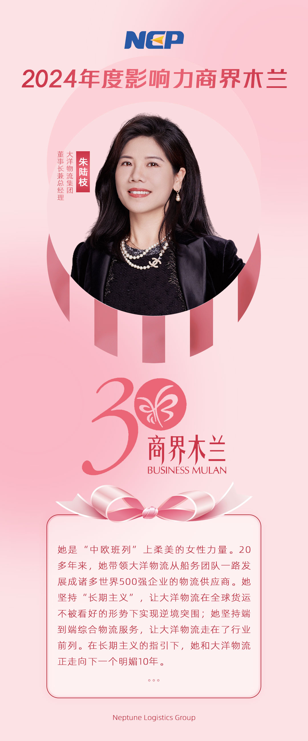 Чжу Лучжи, председатель Neptune Logistics Group, был удостоен звания "Влиятельной бизнес-мулань 2024 года" по версии журнала China Entrepreneur.