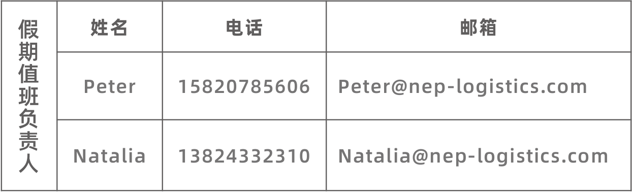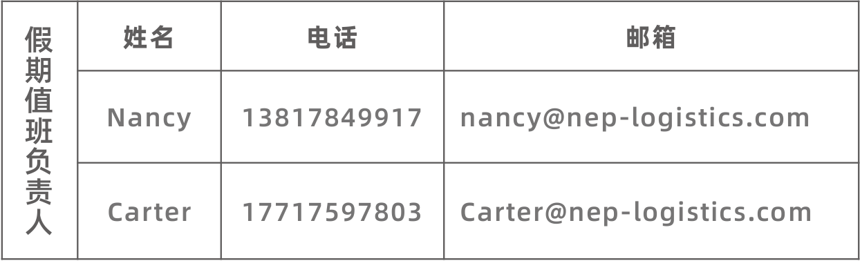 Neptune Logistics Group's domestic subsidiaries have specially set up duty teams. The personnel and contact information of duty teams during the Spring Festival are announced as follows. If you have any requirements, you can contact relevant personnel according to the region.